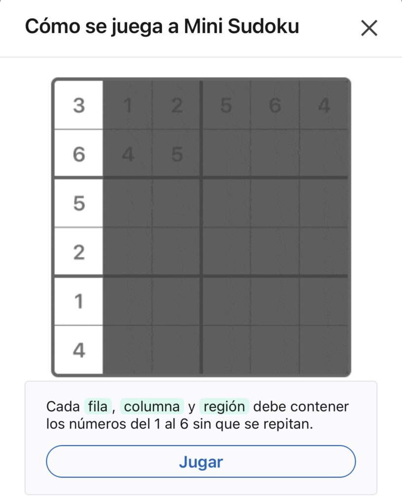 Vemos el caso del mini Sudoku que han reducido los números a 6 (normalmente es hasta 9) para que el reto dure menos.