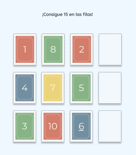 El objetivo del juego es organizar las cartas en mesa para sumar 15 en las filas y hacer combos en función del color y del número de cartas.